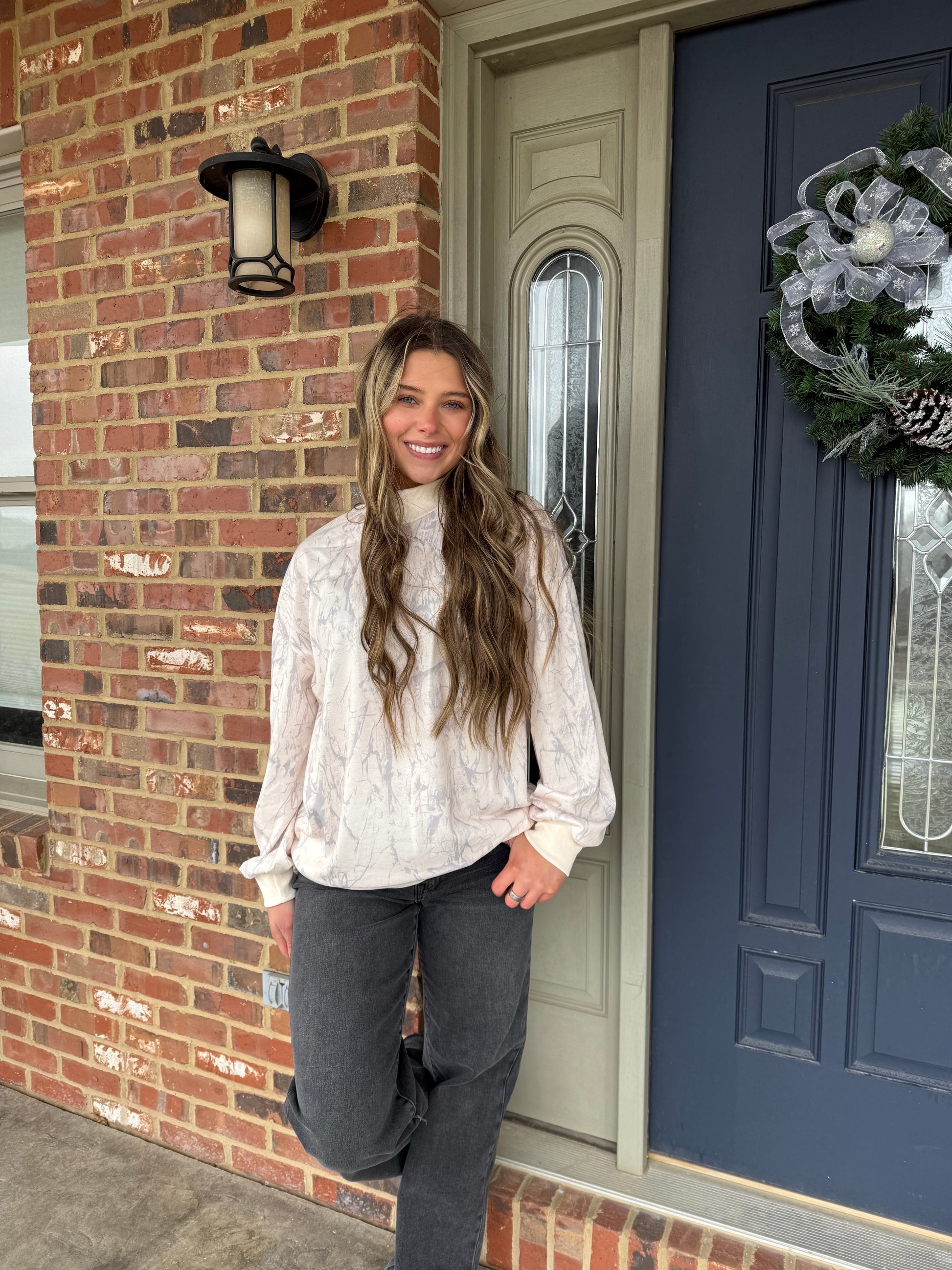 The Woodland Camo Mock Neck Sweatshirt blends laid-back comfort with an elevated, everyday feel. Designed in a soft, lighter-weight fabric with a subtle camo print, this piece features a clean mock neckline and an easy silhouette that drapes effortlessly. The longer torso length adds extra coverage, making it perfect for wearing loose or front-tucked with denim for a relaxed, polished look.